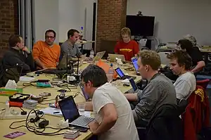 We mostly take a fairly unstructured free-form format. People turn up and start beavering away on something, or they turn up and see what they can help with. However we can also run more structured workshops if there is demand.