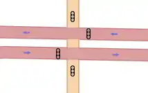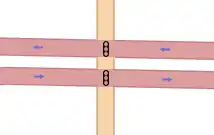 The horizontal ways are actually one large way, represented by two one-way streets. The problem now is that traffic signals should ideally be applied to each way exactly once. As of now, there is no well established convention on how this problem should be ideally solved, but possible taggings which are currently in use are listed below.