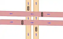 | Vehicle traffic signals before intersection, pedestrian crossings not separately mapped | ||