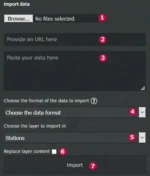 The dropdown menu (5) selects the destination of the imported data. Options are an existing layer or a new layer by Import in new layer.