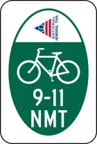 • 9-11 National Memorial Trail (9-11, 2684 km / 1648 miles long, shares several statewide segments of ECG, USBRs and Great Allegheny Passage) in Pennsylvania, Maryland, Virginia, Delaware, New Jersey, New York and the District of Columbia. "9-11 NMT" is defined as an alphanumeric acronym, not a number. Portions of this route are off-road trail (gravel, dirt, otherwise unpaved infrastructure). The September 11th National Memorial Trail uses an M1-8a bicycle route shield bearing the logo of the September 11th National Memorial Trail Alliance and