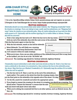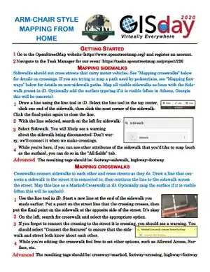 As part of the 2020 GIS Day hosted by the Department of Geography at the University of Georgia, the Undergraduate Student Organization for Geography is hosting two ansychronous mapathon events. One will be completely remote and coordinated through the US Tasking Manager software. The other will be a walking mapathon event, in which students will go on a guided tour around the university while also adding features and POI's to the map. Both mapathons will include demos and documentation on how to get started with OSM and the some editing applications. The iD editor will be recommended for new users for the armchair mapping event and for the walking mapathon, Go Map!! will be recommended for iOS users and Vespucci for participants with androids.