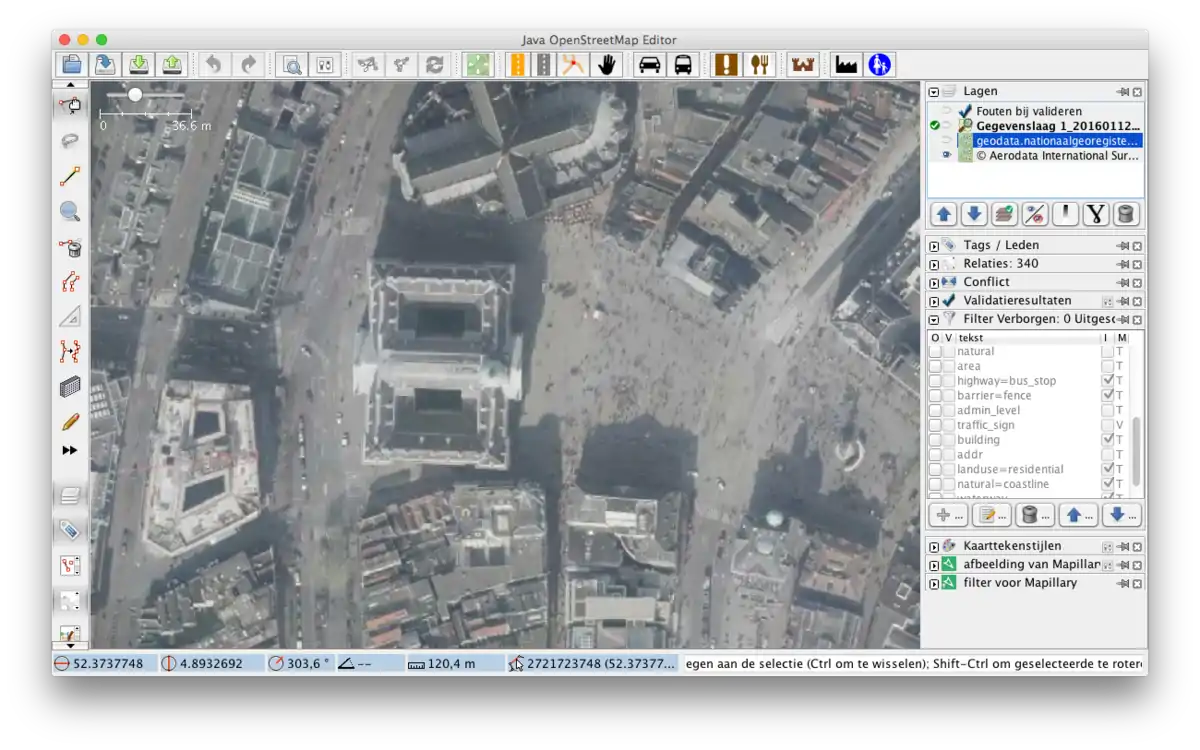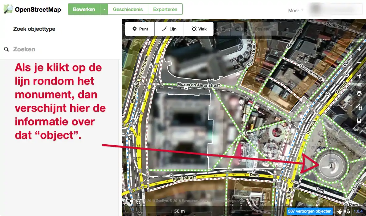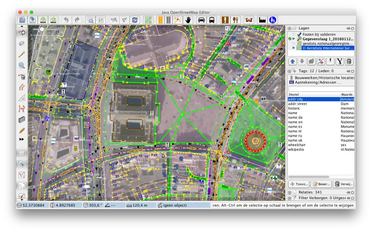 Maar uiteraard kun je ook alle gegevens laten zien die zich op de kaart bevinden, en dat is in onderstaand plaatje te zien. Tevens heb ik hierbij weer het monument op de dam geselecteerd en zie je rechts dezelfde velden die je ook in iD zag. Daaronder de knoppen waarmee je tags kunt toevoegen of bewerken.