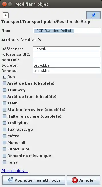 - bus=yes pour indiquer qu'il s'agit d'un arrêt de bus...