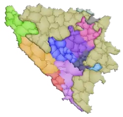 Cities Banja Luka, Bihać, Bijeljina, Cazin, Doboj, Goražde, Livno, Jajce, Mostar, Prijedor, Široki Brijeg, Trebinje, Tuzla, Zenica and Zvornik consist out of the area of previous municipalities of the same name, while Sarajevo and Eastern Sarajevo consist out of several municipalities.
