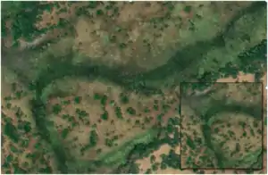 | waterway=riverbank | Berge | Si une berge est visible sur l'imagerie satellite, elle doit être cartographiée comme un polygone. Une ligne pour la voie waterway=river doit être dessinée à l'intérieur de la berge comme indiqué sur la photo.