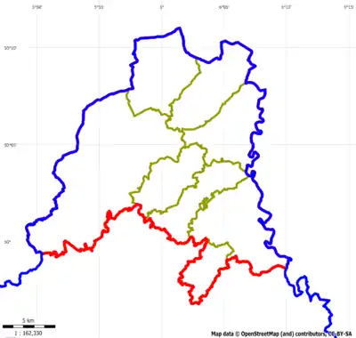 The national border of Luxembourg is a closed relation (ring) consisting of the ways of the physical border lines to Belgium, France and Germany.