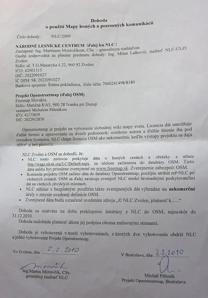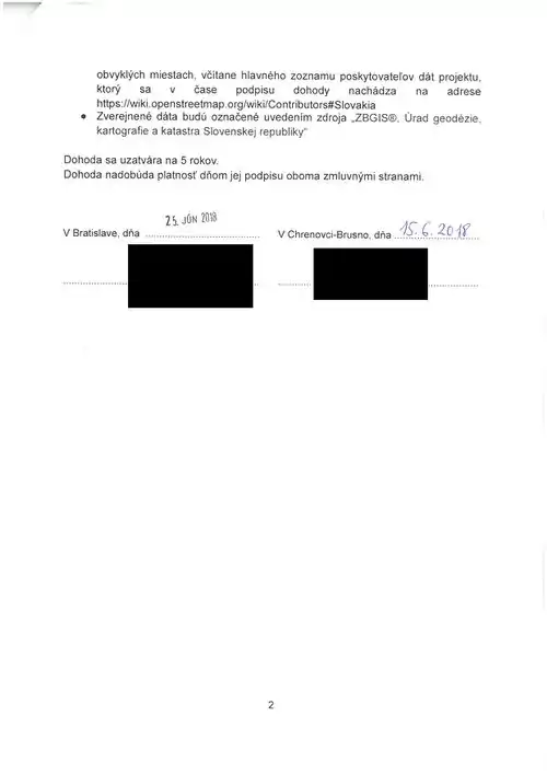 Agreement between Geodetický a kartografický ústav Bratislava (Cartography and Cadastre Authority) and Freemap Slovakia. Agreement is valid for 5 years from June 25, 2018.