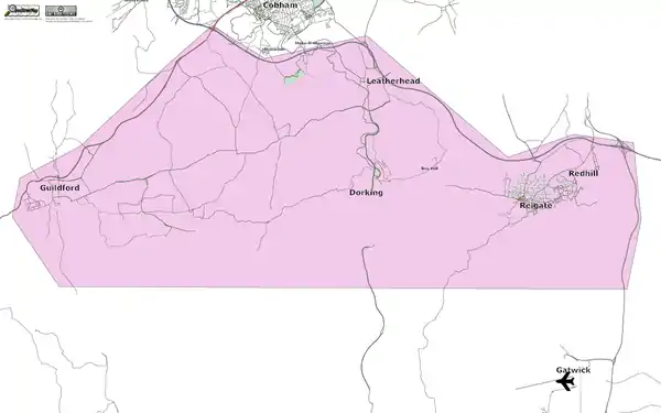The major towns that need to be covered to bridge the gap between Weybridge and Reigate are Leatherhead, Fetcham, Bookham and Dorking. There is also Guildford, the county town of Surrey, to the west.