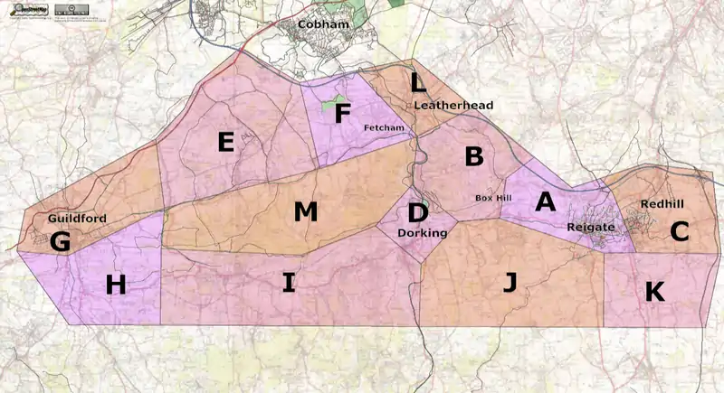 Between Leatherhead and Reigate are part of the Surrey Hills, a designated area of outstanding natural beauty. The North Downs Way and Box Hill are both in this area.