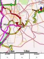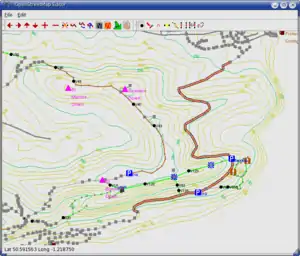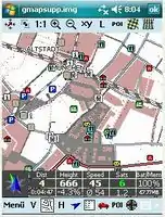 - OziExplorerCE ($ 95 / ??? 69 for life-time license). Runs on various handheld devices starting with Windows CE 3 through Windows Mobile 6+ and CE.net. An unregistered version will require manual GPS communication restart every 20 or 10 minutes. Can be used with any raster map - scanned or converted. Track logs and POIs are compatible with GPSBabel. The GPS recordings will be in NMEA format. If you need the recorded track as a GPX file (for example when you want to upload the recorded tracks directly to the OSM-server) have a look at converting NMEA to GPX.