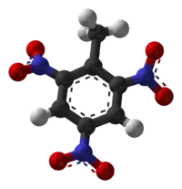 A ball-and-stick model of TNT, an arene bearing nitro groups