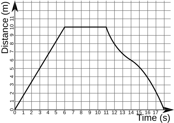 1. In the following distance-time graph, what is the velocity 4 seconds after the beginning of the object's journey?