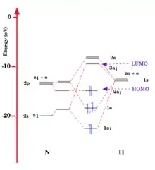 Ammonia or NH3 has 8 valence electrons, consisting of a lone pair on its nitrogen and 3 N-H sigma bonds. The molecular orbital diagram of NH3 is presented in Figure 5 and will be elaborated in regards to its interactions. The s orbitals for the 3 hydrogens are used to set up the sigma and anti bonding combinations of N sp3 orbitals and the H 1s orbitals.