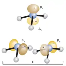 The reduced reducible representation (methodology and concepts further elaborated in Representations section of Advanced Inorganic Chemistry) of the sigma bonds is then written into linear combinations of irreducible representations of ΓSH= a1 + e, as shown in the table. The irreducible representations are determined by the equation ni = 1/h Σ NXRXI where ni is the coefficient of the ith reducible representation, XR and XI are characters of reducible and irreducible representations respectively, N is the coefficient in front of each symmetry elements found on the top row of the character table, and h is the order of the group and sum of the coefficients of the symmetry element symbols.
