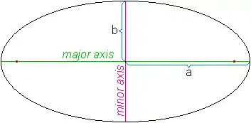 The foci are found on the major axis, which has a length of 2a. The minor axis is 2b, and is smaller.
