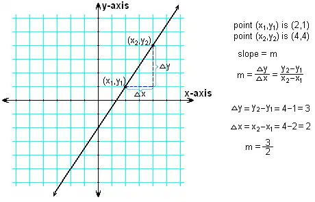 Solution: When calculating the slope of a straight line from two points with the preceding formula, it does not matter which is point 1 and which is point 2. Let's set (x1,y1) as (2,1) and (x2,y2) as (4,4). Then using the two-point formula for the slope m: