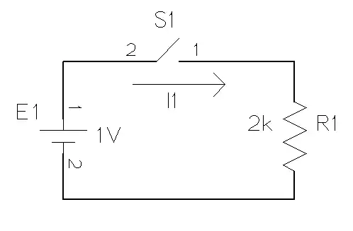 In this circuit, the switch is turned on (closed) and off (open) every half second. Once again, the current travels in the direction of the arrow. The current does not go negative; it thus travels in one direction only. However, it is not constant and is thus considered to be alternating current.
