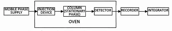 Gas chromatography is a major separation method. It consists of the injection of a gaseous or liquid sample into a gaseous mobile phase which is passed through a column of solid support particles carrying a liquid stationary phase, maintained in an oven at a suitable temperature (which is usually above ambient but need not be above the boiling points of the analytes). Separation is the result of partition between the stationary and mobile phases and the separated constituents of the sample are usually detected by a flame ionization detector. A flow chart of the typical instrumentation for gas chromatography is illustrated in figure D9.1.