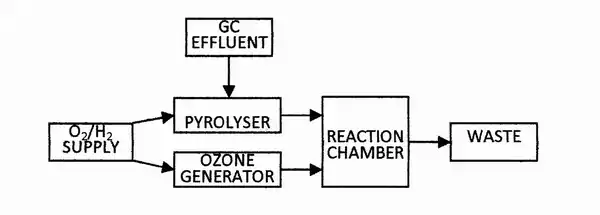 The instrumentation for nitrogen-sulfur chemiluminescence detection is depicted in figure D9.2. The pyrolyser converts the analytes in the gas chromatograph column effluent into the corresponding chemiluminescent species, which pass to the reaction chamber where they react with ozone supplied by a generator. The light emitted is detected by a photomultiplier.