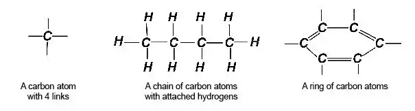 Organic compounds include carbohydrates, proteins and fats or lipids. All organic molecules contain carbon atoms and they tend to be larger and more complex molecules than inorganic ones. This is largely because each carbon atom can link with four other atoms. Organic compounds can therefore consist of from one to many thousands of carbon atoms joined to form chains, branched chains and rings (see diagram below). All organic compounds also contain hydrogen and they may also contain other elements.