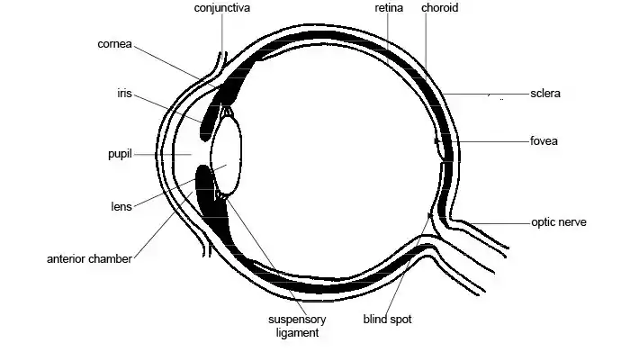 optic nerve | choroid | cornea | aqueous humor | retina | cones | iris | vitreous humour | sclera | lens