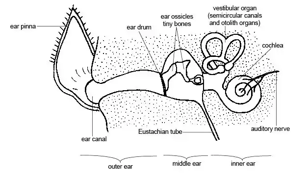 Most of the ear, the organ of hearing, is hidden from view within the bony skull. It consists of three main regions: the outer ear, the middle ear and the inner ear (see diagram 15.9).