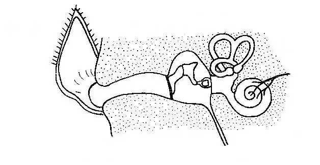 • The external pinna helps funnel sound waves into the ear and locate the direction of the sound. The sound waves travel down the external ear canal to the eardrum or tympanic membrane causing it to vibrate. This vibration is transferred to the auditory ossicles of the middle ear which themselves transfer it to the inner ear. Here receptors in the cochlea respond by generating nerve impulses that travel to the brain via the auditory (acoustic) nerve.