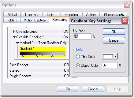 Object Color sets the brightness of the tones based on the Gradient bar. A standard render would have the Position percent and the Object Color persent set to the same value. If the Object Color percent is set higher than the Position of the Key point, the render will have darker highlights. If the Object Color Percent is set lower than the Position of the Key point, the render will appear to have less darkness.