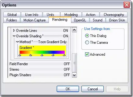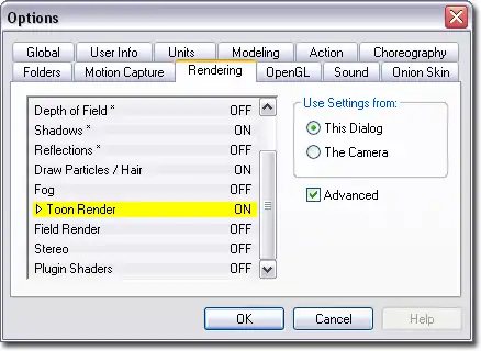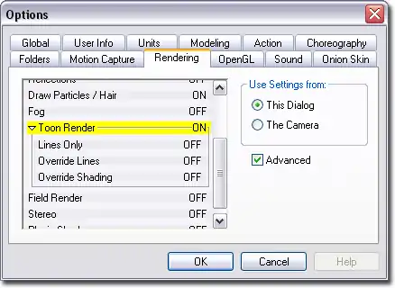 To turn Toon Render ON, click Tools on the menu bar and select Options, or press Ctrl+P to bring up the Options window. Click on the Rendering tab, make sure that Advance is checked, and click on the OFF next to Toon Render to turn it to ON.