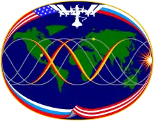 The earth rotates with respect to the orbit, which means that the orbital plane is essentially stationary in space while the earth rotates. The sine wave formed by the ground track is displaced by the number of degrees each orbit by the number of degrees that the earth rotates during the orbital period. The image below shows a satellite ground track through two of earth's rotations: