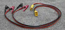 When a battery fails or is discharged, such as by inadvertently leaving one's headlights switched on while parked, the car's engine will not "turn over" when the ignition key is turned. Many motorists carry "jumper cables" which consist of a pair of heavy gauge wires with large crocodile clips at each end.
