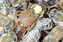 The queen bee is wholly unable to care for herself, because of this she is often surrounded by a ring of attendant bees that follow her, feed her, groom her and carry away her waste.