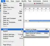 2. Go to File > Import > Import to library / to stage. If you import to library, the file will appear in your library with the name the external file has. If you import to stage, the file will appear on the stage. The method you choose is up to you, but I generally import to library and then drop the file into another symbol (see below).