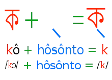 The hôsônto or hôlônto is a diacritic looking like a diagonal tick mark going from north-west to south-east direction. In Bengali, all consonants are pronounced with an inherent অ (ô, /ɔ/), so ক is actually pronounced kô (/kɔ/). Adding the hôsônto means that you are removing that অ (ô, /ɔ/). Therefore ক্ is simply /k/. It is worthwhile to mention that kô is also the name of ক. In this way all the consonants are named. An exception to this are the consonants জ and ব. These two are called বর্গীয়-জ (borgio-jô, /bɔrgiɔ ɟɔ/) and বর্গীয়-ব (borgio-bô, /bɔrgiɔ bɔ/) respectively, in order to distinguish them from য and the second ব, mentioned in Consonants, Part Two.