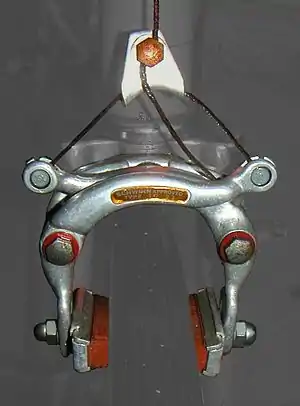 There are many different types of brakes for bicycles. Most bicycle brake systems have three basic parts: a mechanism for the rider to apply the brakes, such as brake levers or pedals; cables or the bicycle chain to enact the braking of the bicycle; and the brake itself, a pad or the reversal of momentum, which actually stops the bicycle with pressure.