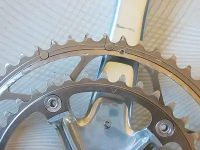 A two-ring assembly. Notice the bolts with slotted nuts that fasten the chain rings to the spider of the crank, and the crank arm extending upward. When a guard plate is installed (not shown), it is spaced from the largest ring to allow clearance for the chain.
