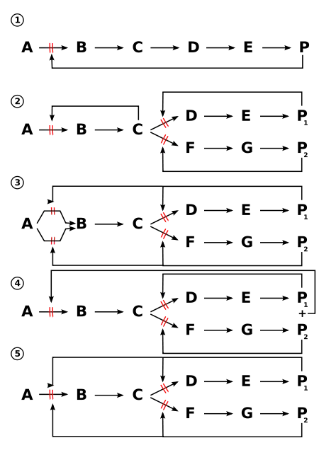 1. The basic feedback inhibition mechanism, where the product (P) inhibits the committed step (AB).