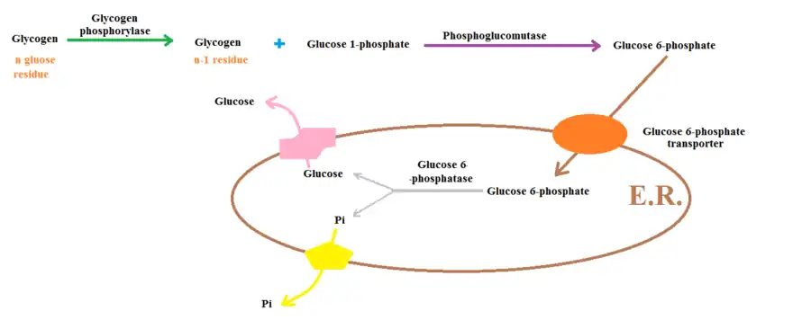 Glucose 1-phosphate gained by means of glycogen phosphorylase, is converted into glucose 6-phosphate that will be transported into endoplasmic reticulum where glucose 6-phosphate is divided into inorganic phosphate (Pi) and glucose molecule.Then, glucose is released form E.R. by the help of its transported, as it is true for Pi.