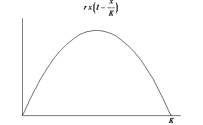 The parabolic function (square function) in Eq. 4.1, shown in Figure 4.1, describe and increasing biomass growth as the population biomass increases, up to a certain population size (which is easy to identify as K/2), where the biomass growth starts declining to reach zero at biomass level K. K therefore represents a natural equilibrium biomass of an unexploited stock.
