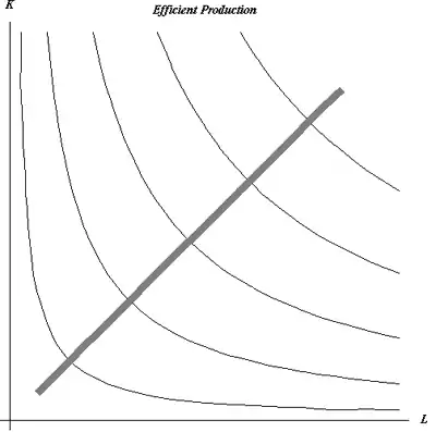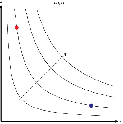 L (Labour) can be substituted by K (Capital) and the other way around, each curve representing a constant output of F. The blue point is representing a certain production of fishing effort involving a high degree of labour inputs, while much of the labour in the red point is substituted by capital, e.g. small boats and hand line (blue point) vs. a few trawlers (red point). The dotted arrow indicates increase in effort production.