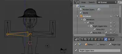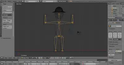 Noob Note: If you've been adding bones to your simple person from the previous lessons, you will have likely noticed that the hat seems to stretch when you move the arms in pose mode. To fix this, you will need to remove the hat from the forearm vertex groups created in the Parenting step.