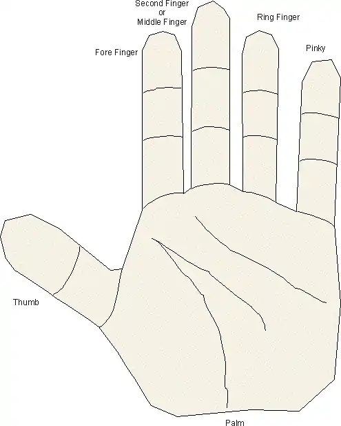 The graphic below shows a human hand. The point at which the hand/fingers bend, are potential palming locations. In addition to the fingers and their respective joints, items are also palmed using the muscles in the palm of the hand.