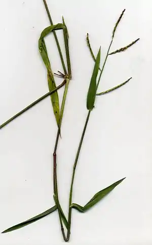 <== A collected specimen (grass) folded over and scanned to display all of a culm. Note that the culm terminates in an inflorescence and is actually one of two stemsthe other, with but one leaf, is just elongatingarising at a prominent node along a stolon. Several roots are starting to form at the same node.