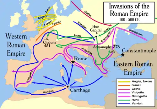 Migration Period was a period of barbarian invasions of Europe. The can be seen as beginning with the invasion of Europe by the Huns in 375, and ending with the conquest of much of Italy by the Lombards by 568; but sometimes it is extended from circa 300 until circa 800.