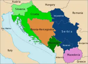 Yugoslav Wars (1991–2001) were civil wars that resulted in the partitioning of the six constituent republics of Yugoslavia; plus the self-proclaimed Republic of Kosovo in 2008. The countries are: