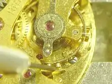 Under a shock, the heavy rim of the balance would displace and contact a rim around the circumference before enough force was applied to damage the staff or jewels. (Note the cap jewel with no shock spring)