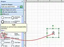 Visio© uses drag and drop to create diagrams that use shapes provided on shape ‘stencils’. Connectors that are included on the stencils are used to indicate flows, relationships, messaging or other object interface connections or associations. Objects may be modified in Visio© by right-mouse clicking on them. The pop-up menu displayed may include extra properties embedded in the object that can be adjusted.