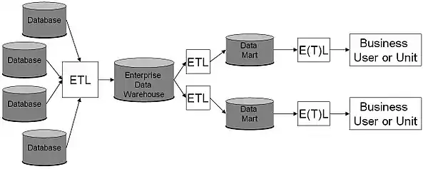 Another type of data warehouse architecture is presented in the figure depicting no Enterprise Data Warehouse. This structure presents some difficulties because it is less likely that the measures and data exist outside the databases in an easily extractable structure. This case is generally rare in large organizations.