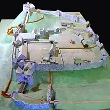 A reconstruction of Carisbrooke Castle in England during the 14th century, showing the keep built on the motte (top) and the bailey (bottom)